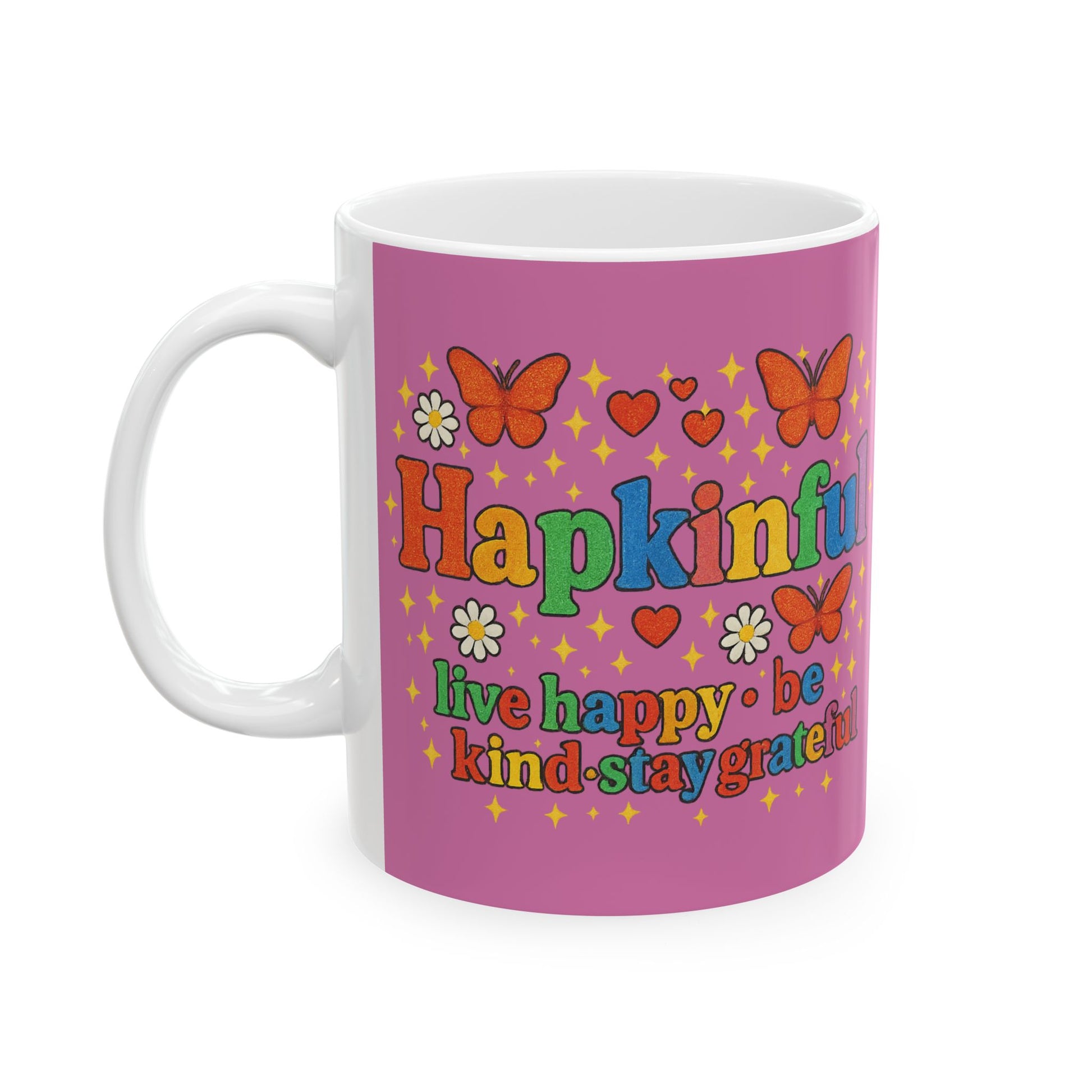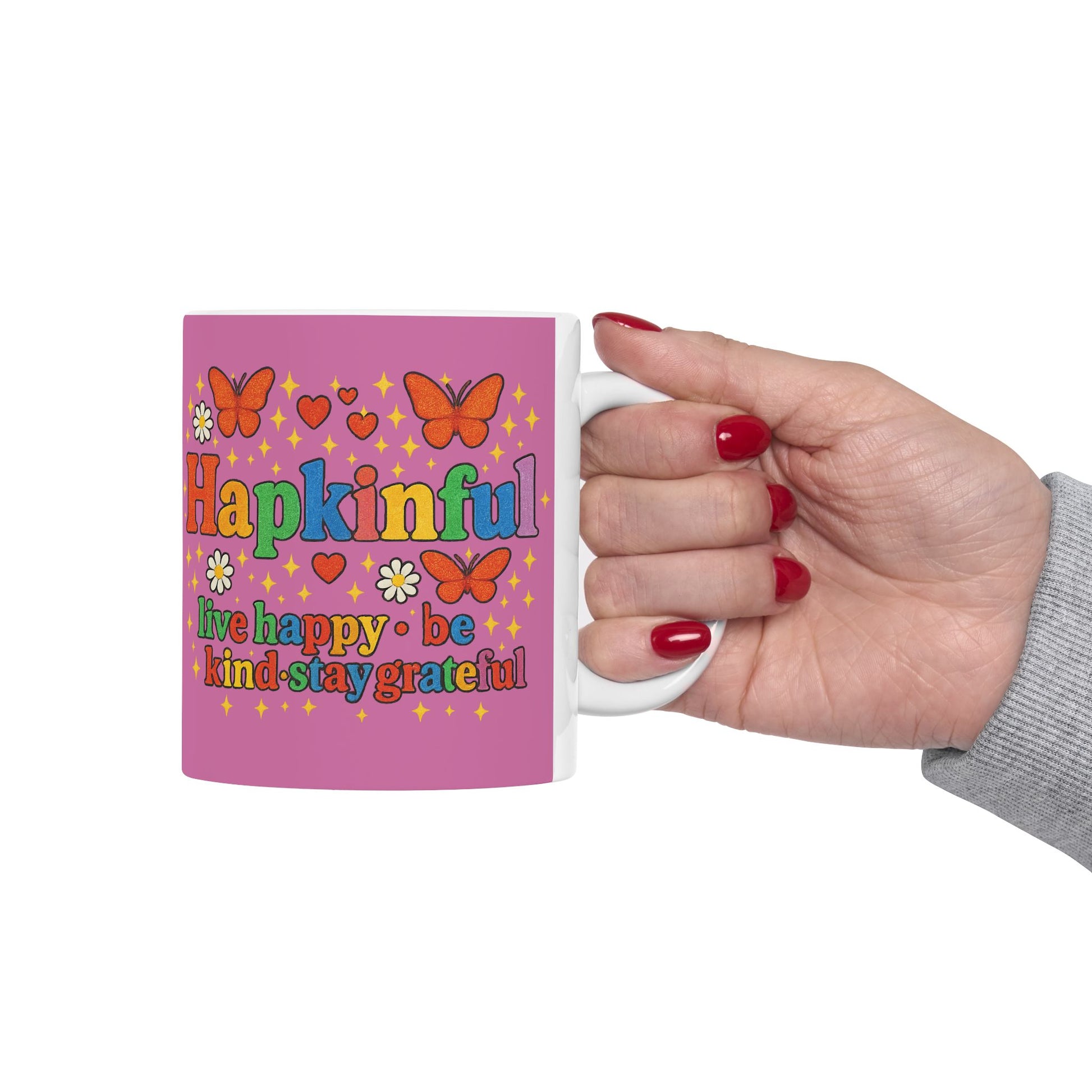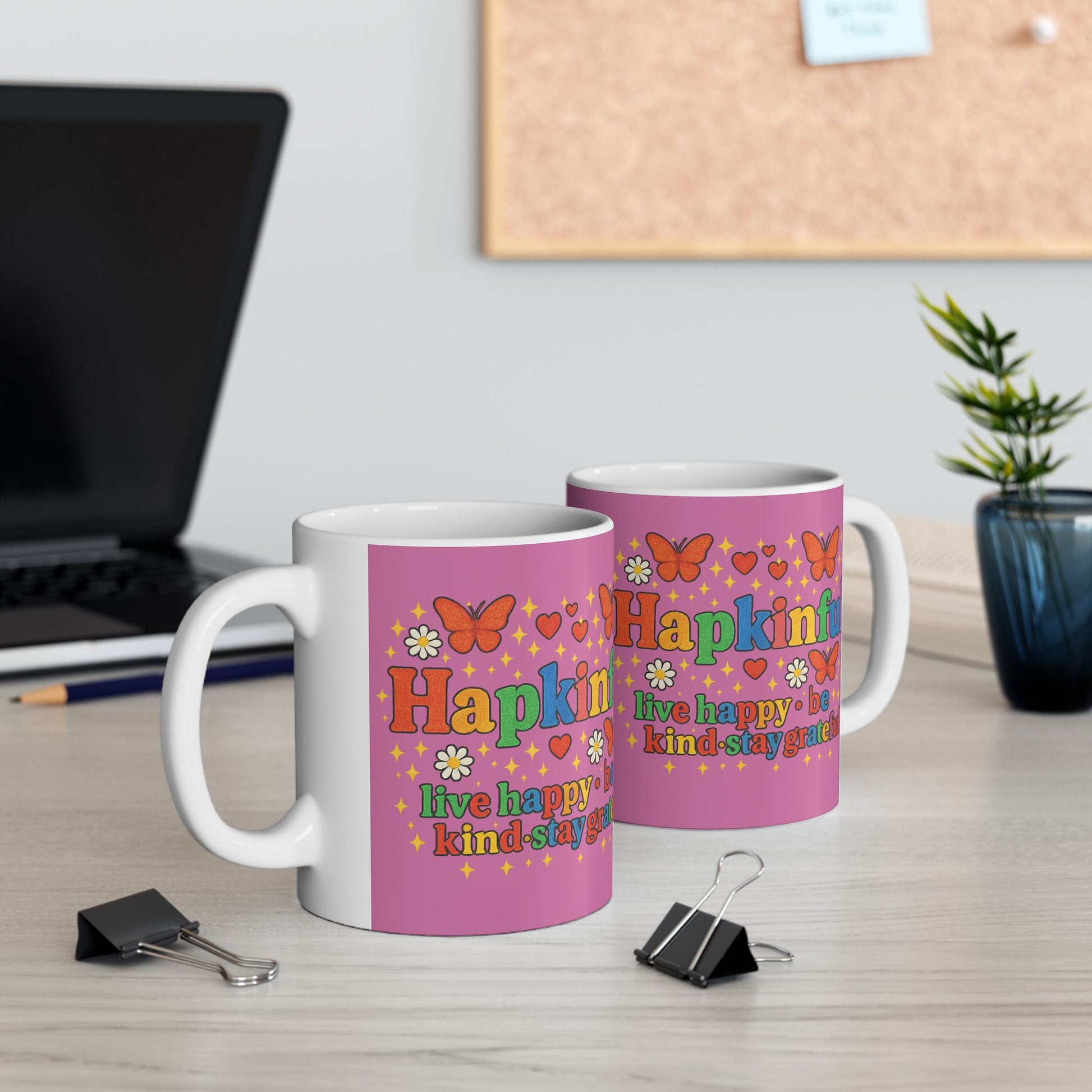 Happy Groovy Pink Butterfly Mug - Hakinful - Live Happy. Be Kind. Stay Grateful 11oz.