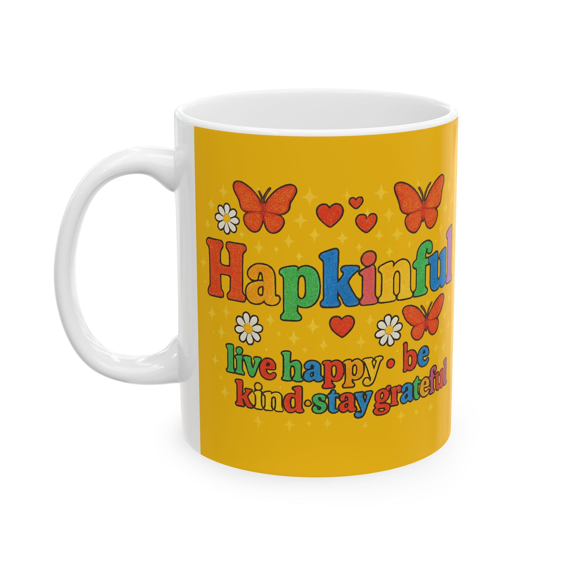 Start the day with a splash of positivity! Take a sip of adventure with the Happy Groovy Butterfly Yellow Ceramic Mug! Featuring the inspiring message "Hapkinful Live Happy. Be Kind. Stay Grateful.", This 11oz mug is part of the charming Animal and Fish Mug Collection. Perfect for little ones and has matching tshirts, jigsaw puzzles and stickers too. Collect them all and encourage your little one to spread happiness, kindness, and gratitude one sip at a time! Perfect for gift giving too!