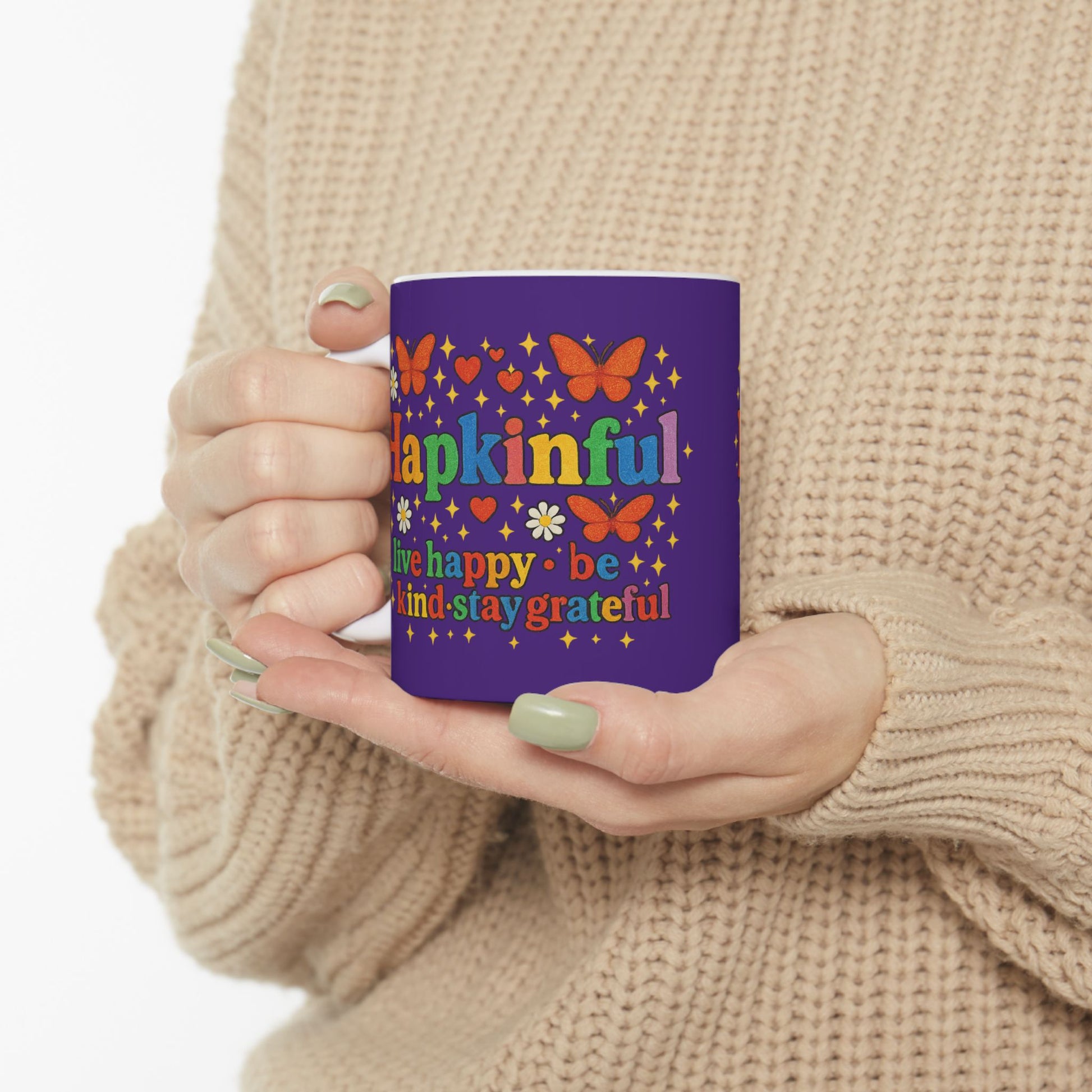 Start the day with a splash of positivity! Take a sip of adventure with the Happy Groovy Butterfly Blue Ceramic Mug! Featuring the inspiring message "Hapkinful Live Happy. Be Kind. Stay Grateful.", This 11oz mug is part of the charming Animal and Fish Mug Collection. Perfect for little ones and has matching tshirts, jigsaw puzzles and stickers too. Collect them all and encourage your little one to spread happiness, kindness, and gratitude one sip at a time! Perfect for gift giving too!
