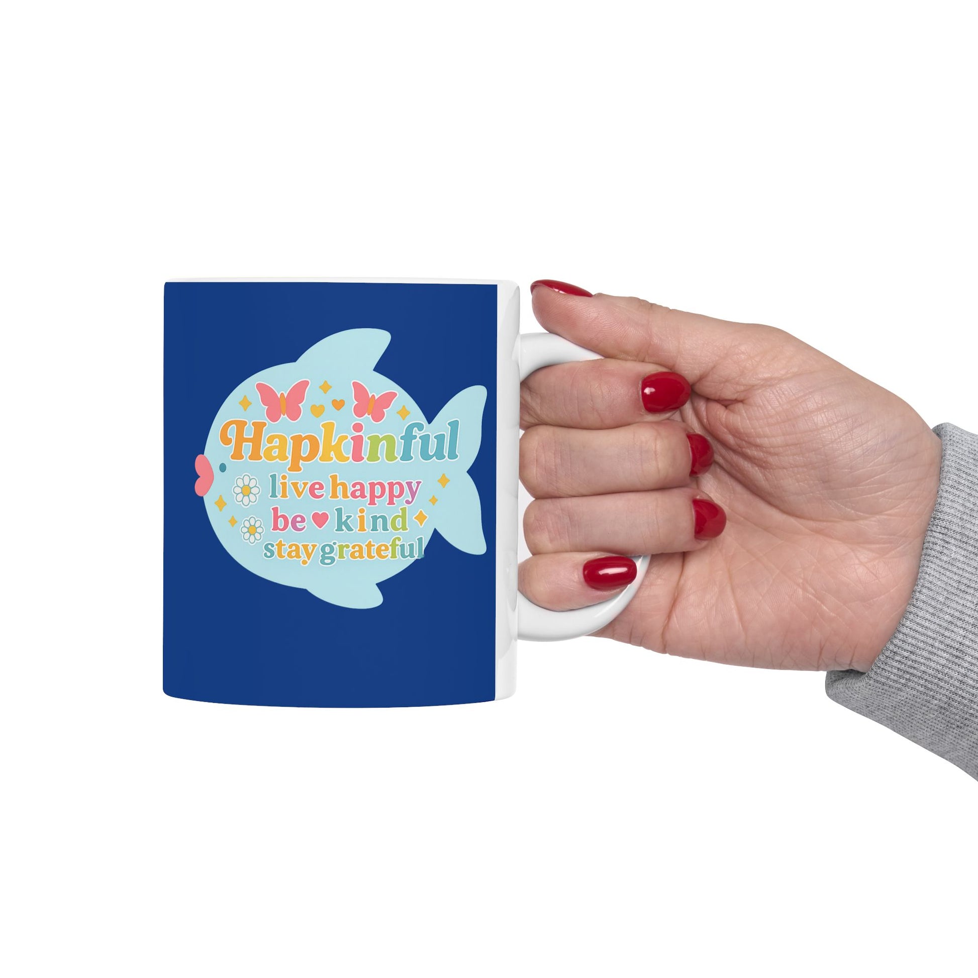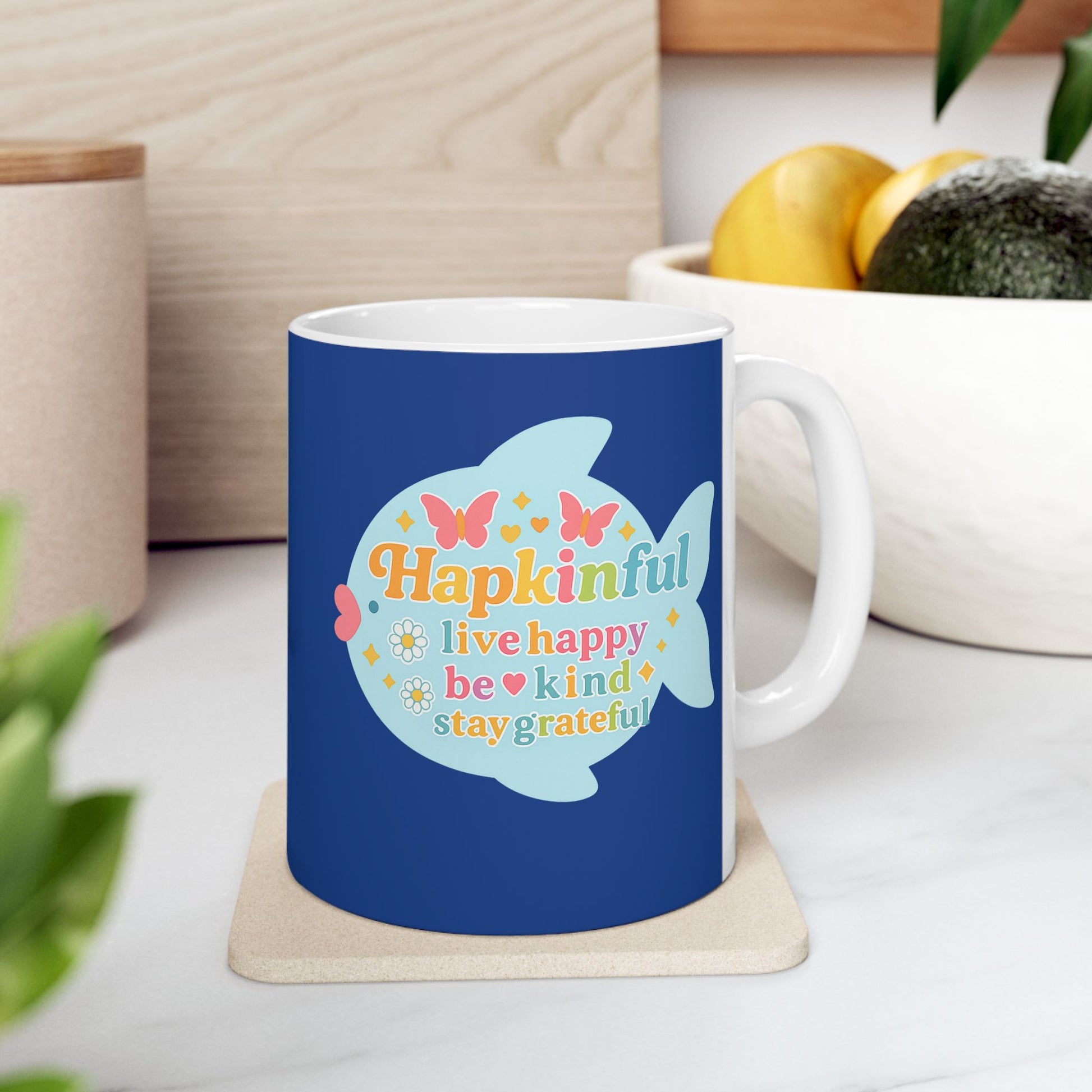 Start the day with a splash of positivity! Take a sip of adventure with the Happy Fish Ceramic Mug! Featuring the inspiring message "Hapkinful Live Happy. Be Kind. Stay Grateful.", This 11oz mug is part of the charming Animal and Fish Mug Collection. Perfect for little ones and has matching tshirts, jigsaw puzzles and stickers too. Collect them all and encourage your little one to spread happiness, kindness, and gratitude one sip at a time! Perfect for gift giving too!