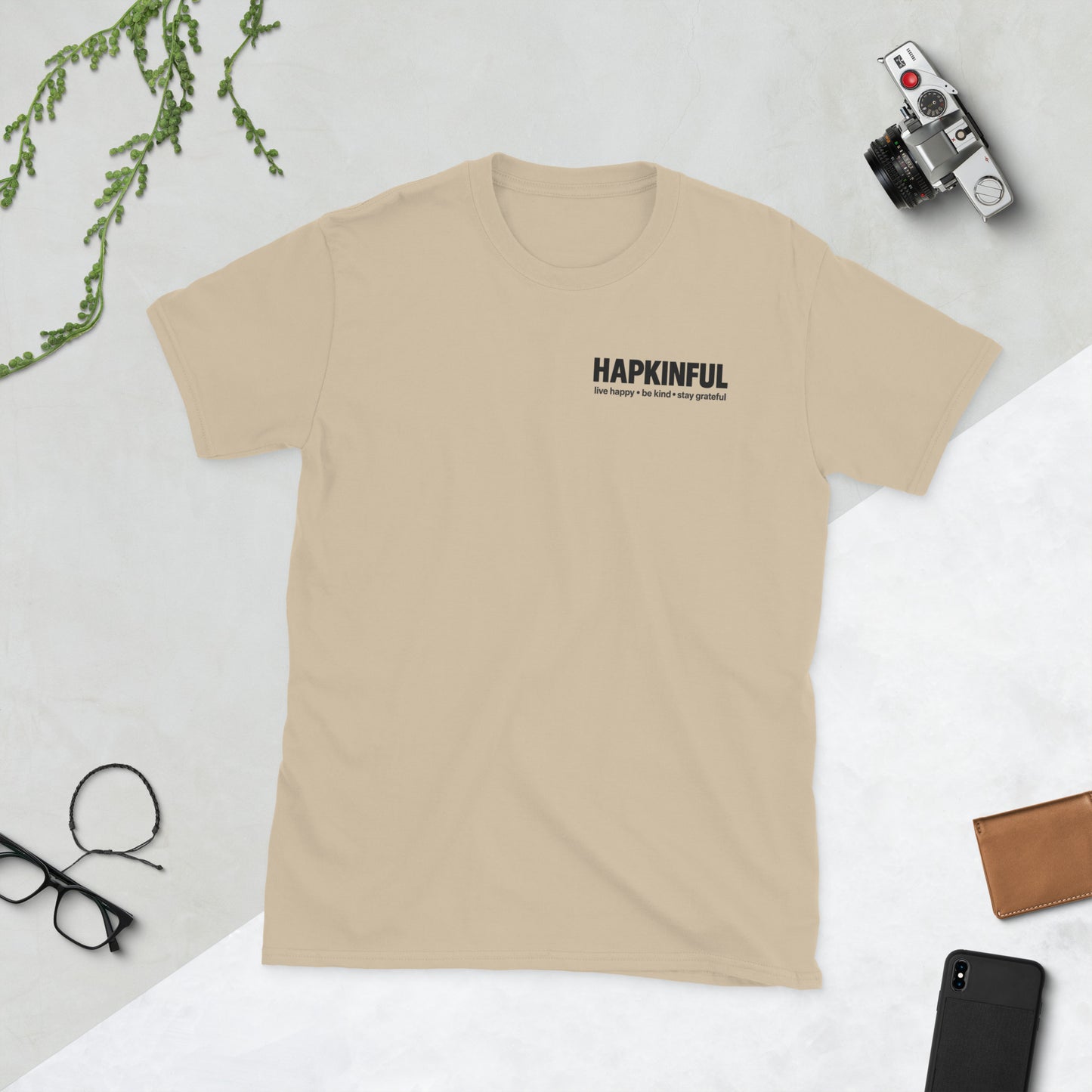 Discover your new favorite tee with the Happy Simple Gildan T-shirt from Hapkinful’s Simple Collection. Crafted from 100% ring-spun cotton, it’s soft, comfy, and perfect for everyday wear. Double stitching on the neckline and sleeves means it’s built to last through all your adventures. Wear it and embrace the vibe: Live Happy. Be Kind. Stay Grateful. Be Hapkinful!