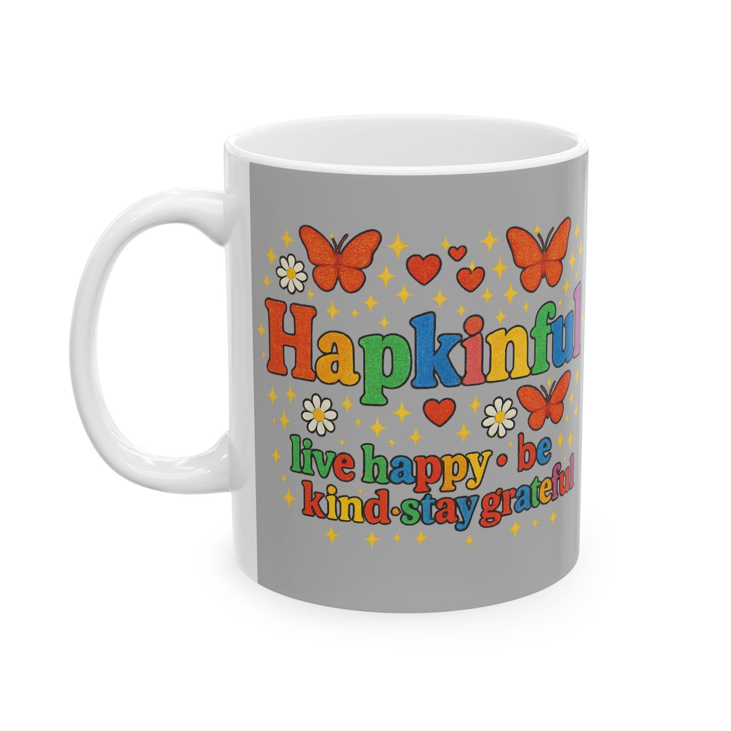 Start the day with a splash of positivity! Take a sip of adventure with the Happy Groovy Butterfly Light Grey Ceramic Mug! Featuring the inspiring message "Hapkinful Live Happy. Be Kind. Stay Grateful.", This 11oz mug is part of the charming Animal and Fish Mug Collection. Perfect for little ones and has matching tshirts, jigsaw puzzles and stickers too. Collect them all and encourage your little one to spread happiness, kindness, and gratitude one sip at a time! Perfect for gift giving too!