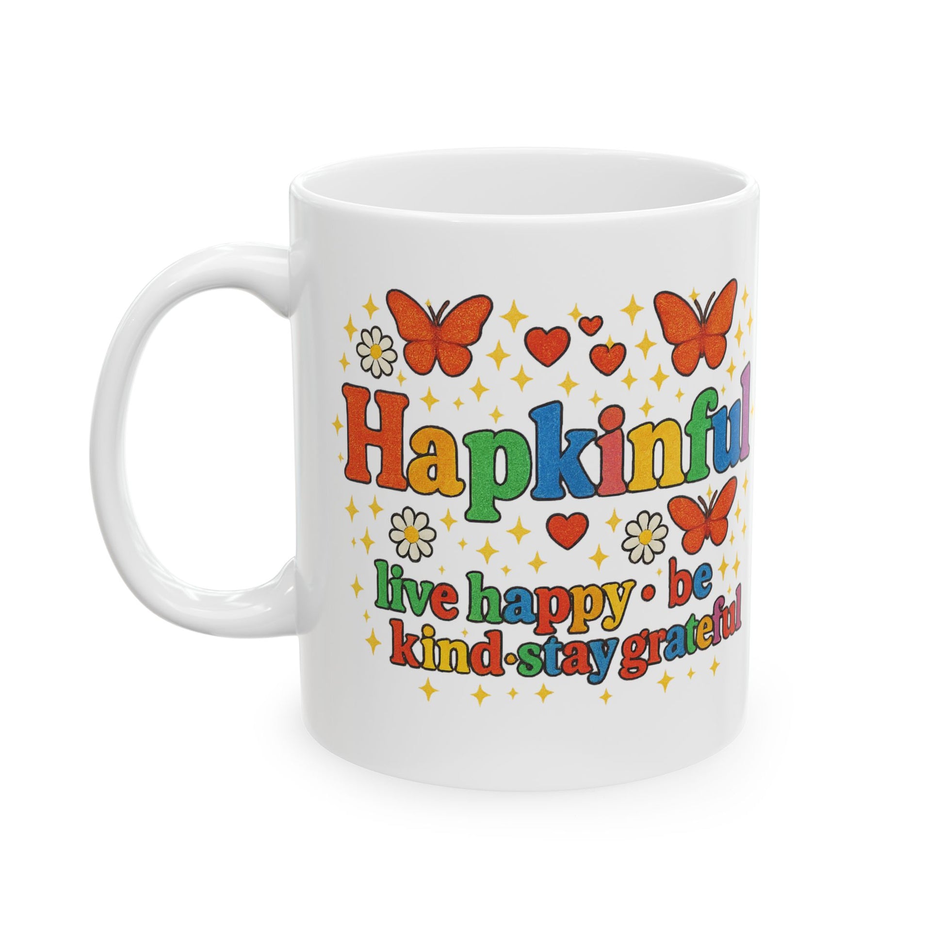 Start the day with a splash of positivity! Take a sip of adventure with the Happy Groovy Butterfly White Ceramic Mug! Featuring the inspiring message "Hapkinful Live Happy. Be Kind. Stay Grateful.", This 11oz mug is part of the charming Animal and Fish Mug Collection. Perfect for little ones and has matching tshirts, jigsaw puzzles and stickers too. Collect them all and encourage your little one to spread happiness, kindness, and gratitude one sip at a time! Perfect for gift giving too!