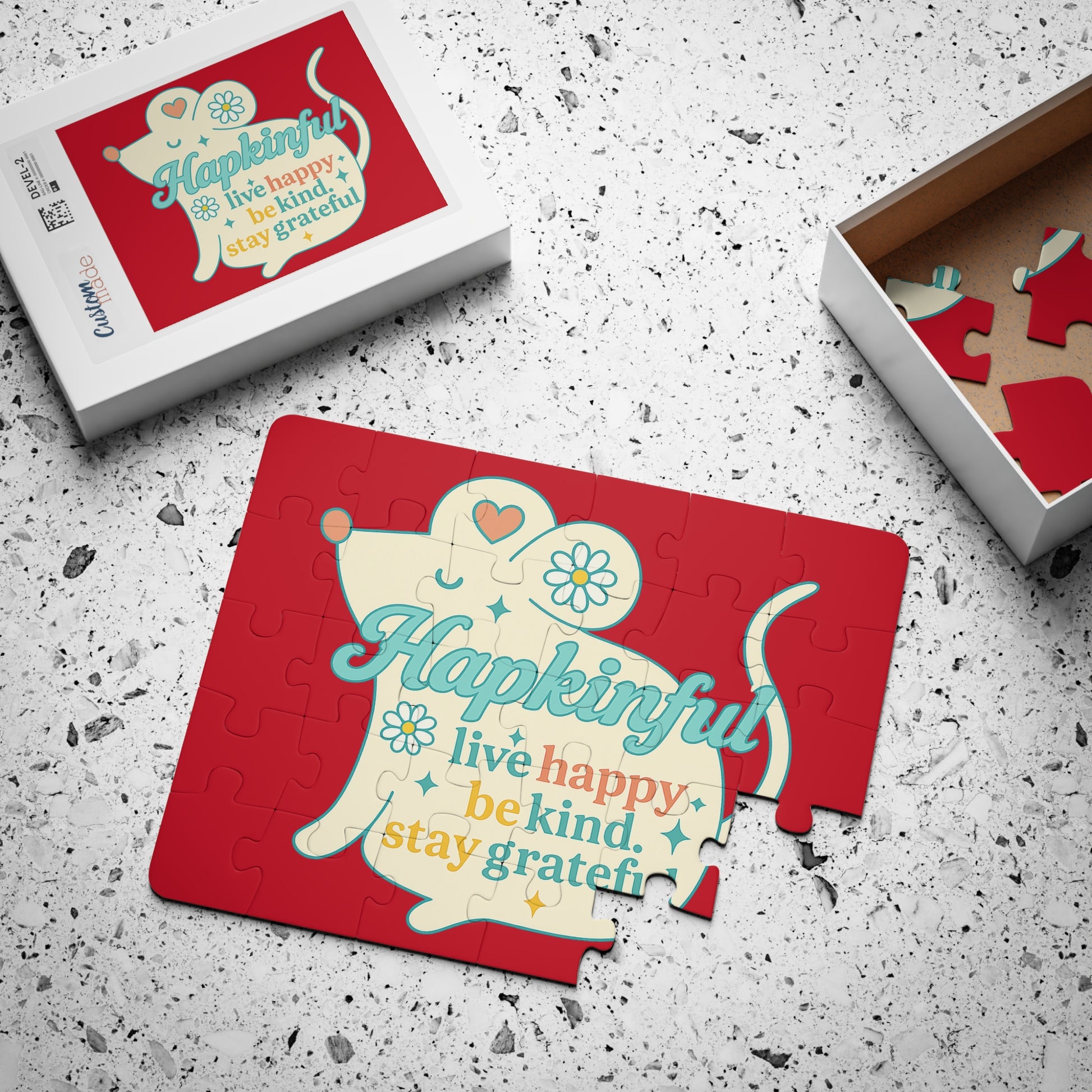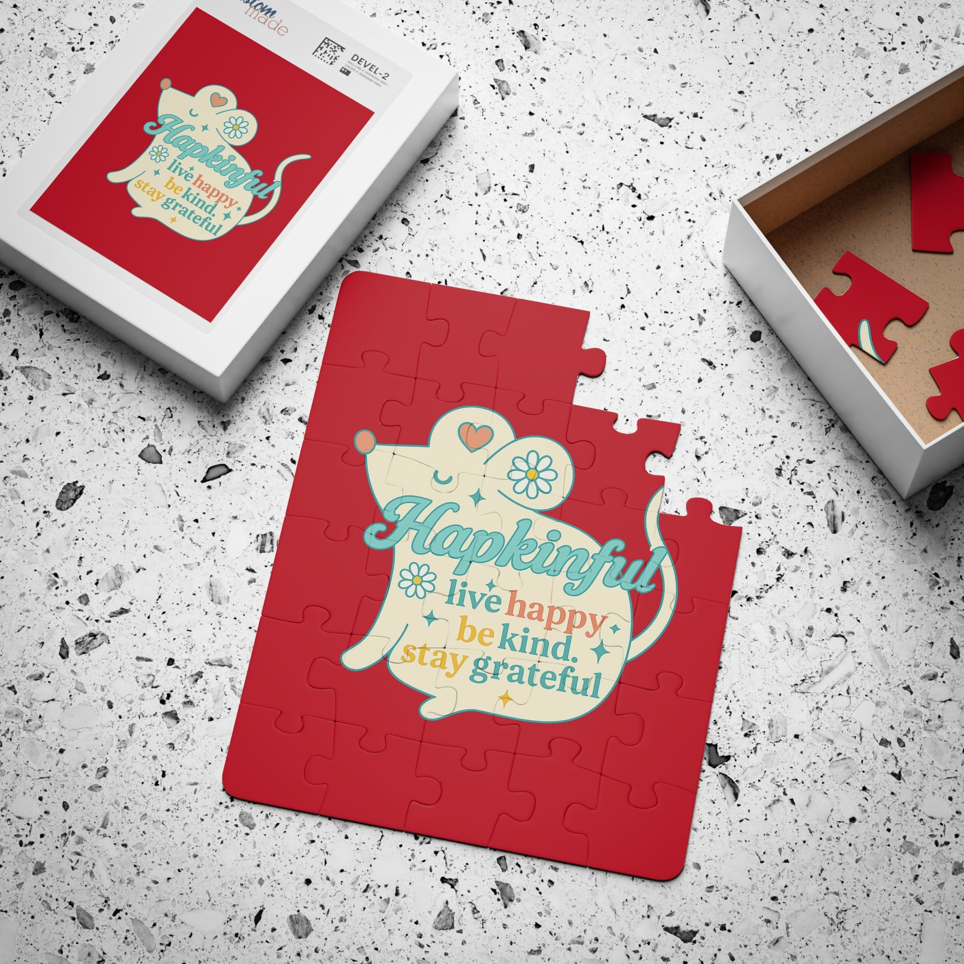 A beautiful Happy Mouse Jigsaw Puzzle! With 30 pieces, this puzzle not only teaches cognitive skills, such as reading and speech but also promotes happiness, kindness, and gratitude. Designed for ages 3 and up, it's perfect for little hands to develop coordination while learning important values. Get ready for some adventurous fun! Also available in tshirts, mugs and stickers. Have fun collecting them all........