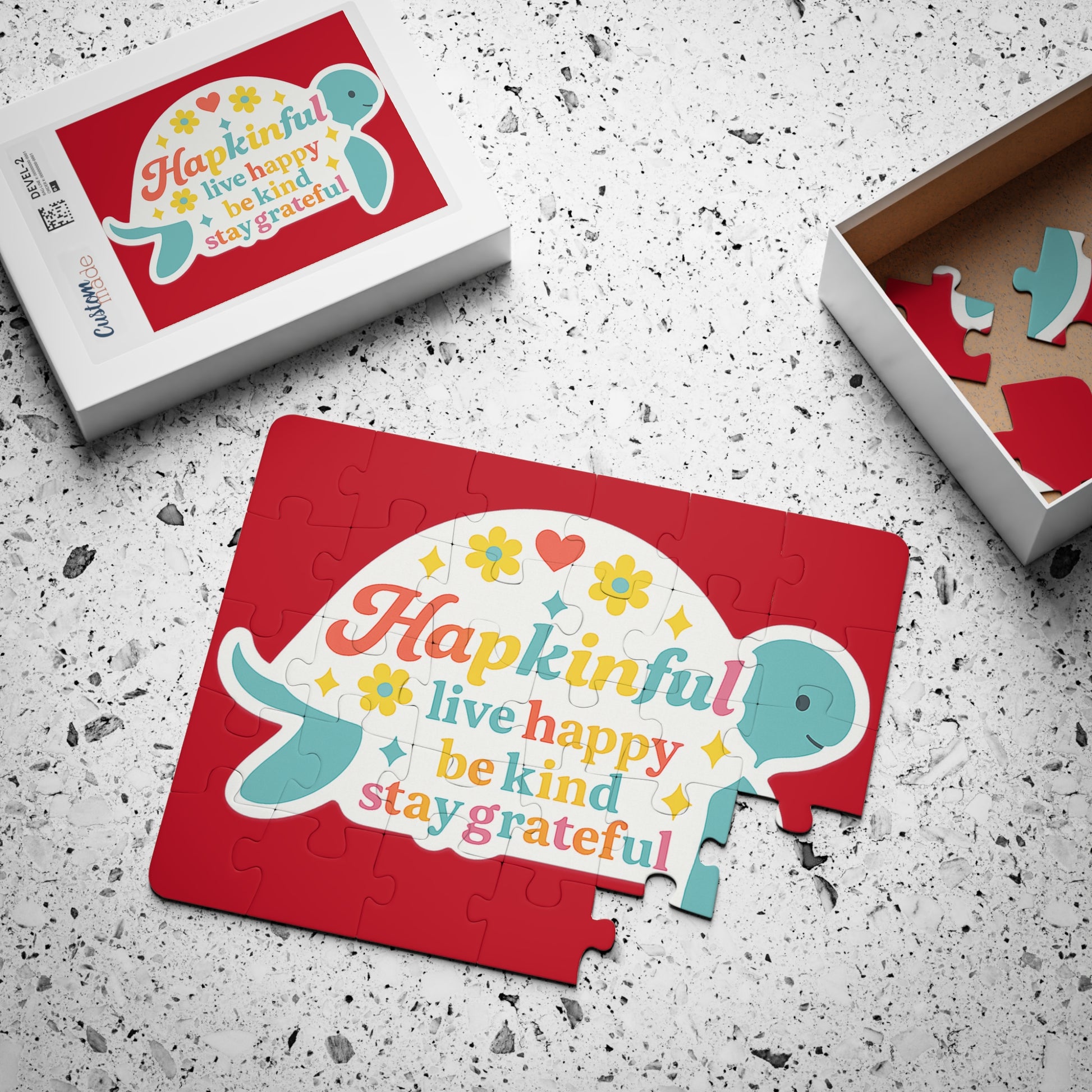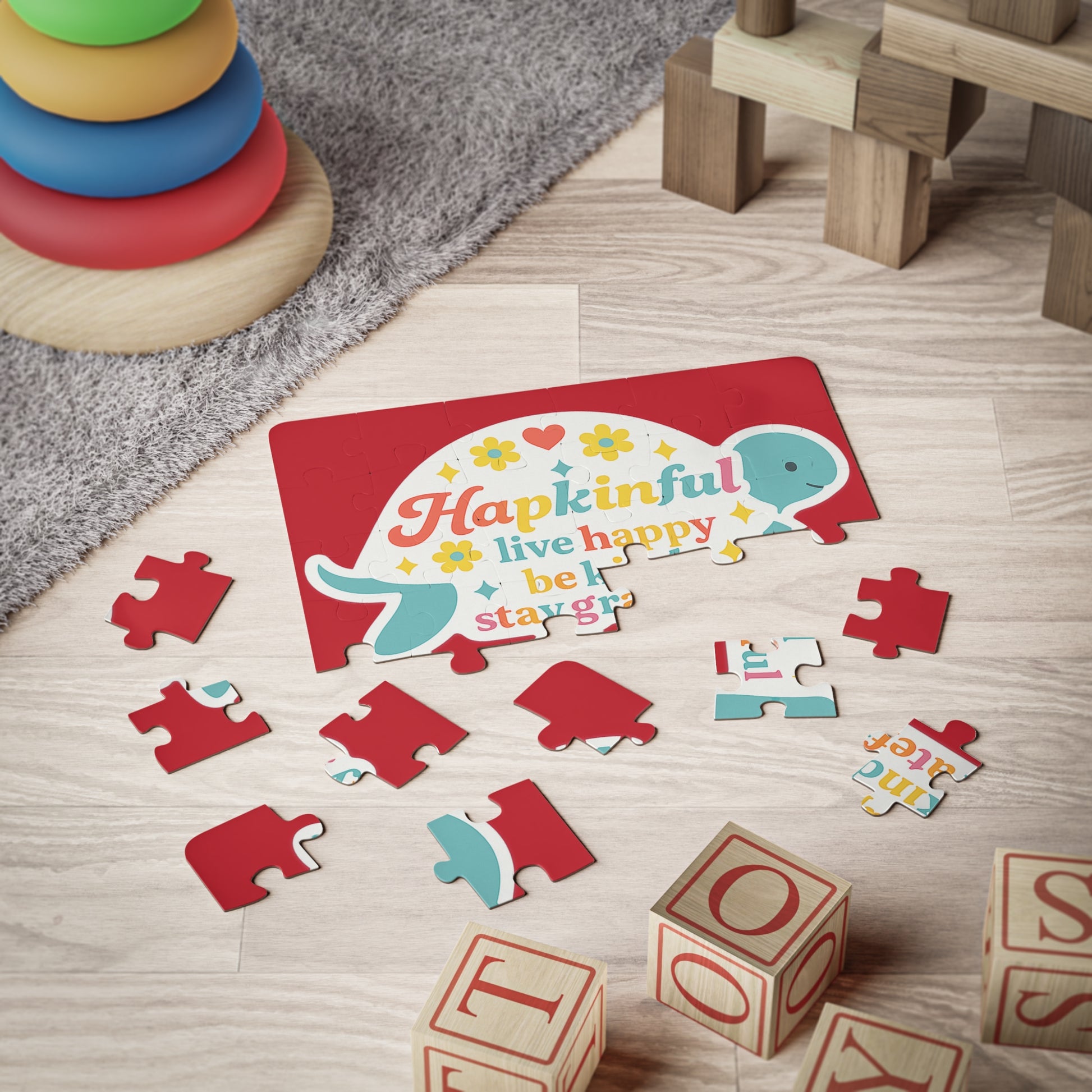 A beautiful Happy Turtle Jigsaw Puzzle! With 30 pieces, this puzzle not only teaches cognitive skills, such as reading and speech but also promotes happiness, kindness, and gratitude. Designed for ages 3 and up, it's perfect for little hands to develop coordination while learning important values. Get ready for some adventurous fun! Also available in tshirts, mugs and stickers. Have fun collecting them all........