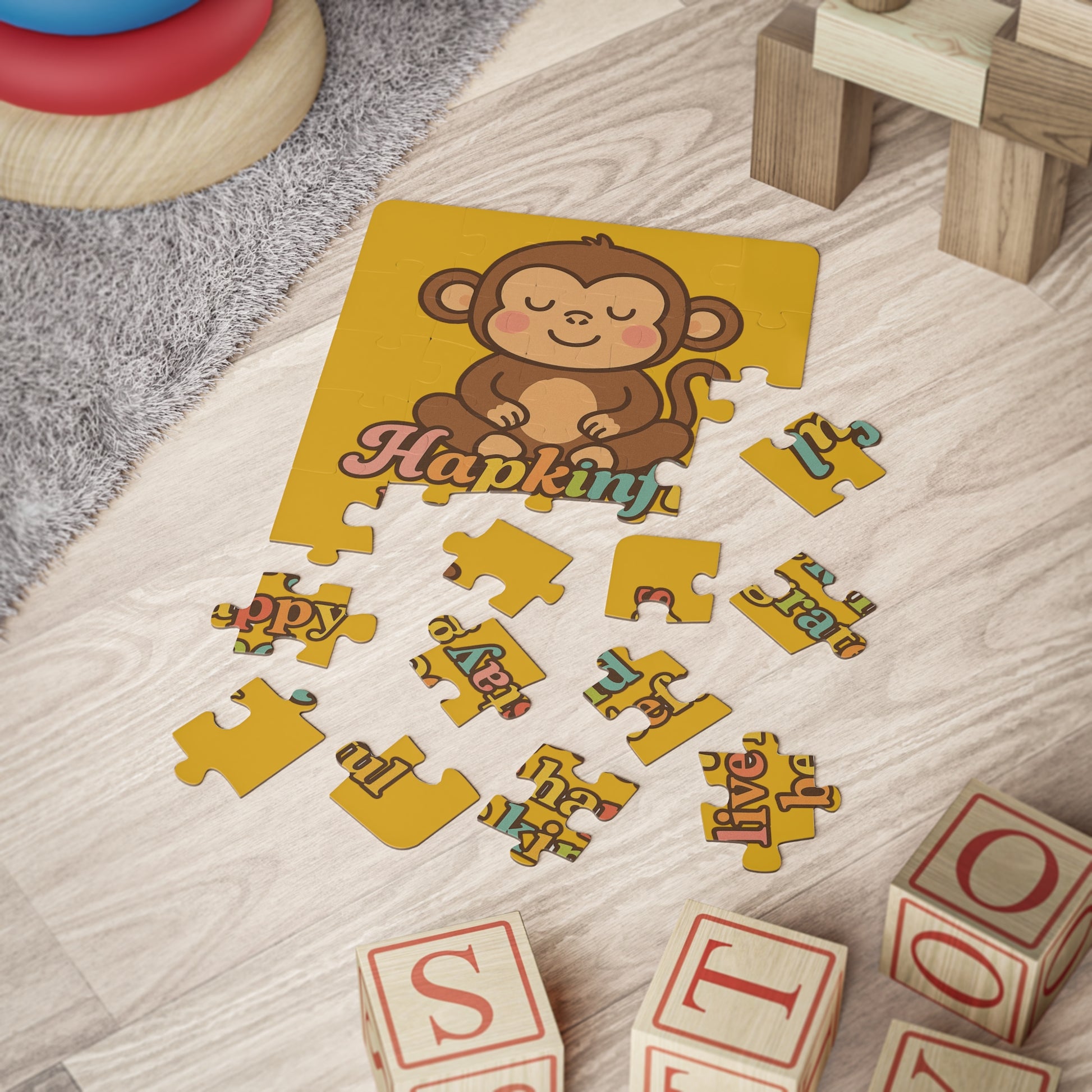 A beautiful Happy Monkey Jigsaw Puzzle! With 30 pieces, this puzzle not only teaches cognitive skills, such as reading and speech but also promotes happiness, kindness, and gratitude. Designed for ages 3 and up, it's perfect for little hands to develop coordination while learning important values. Get ready for some adventurous fun! Also available in tshirts, mugs and stickers. Have fun collecting them all........